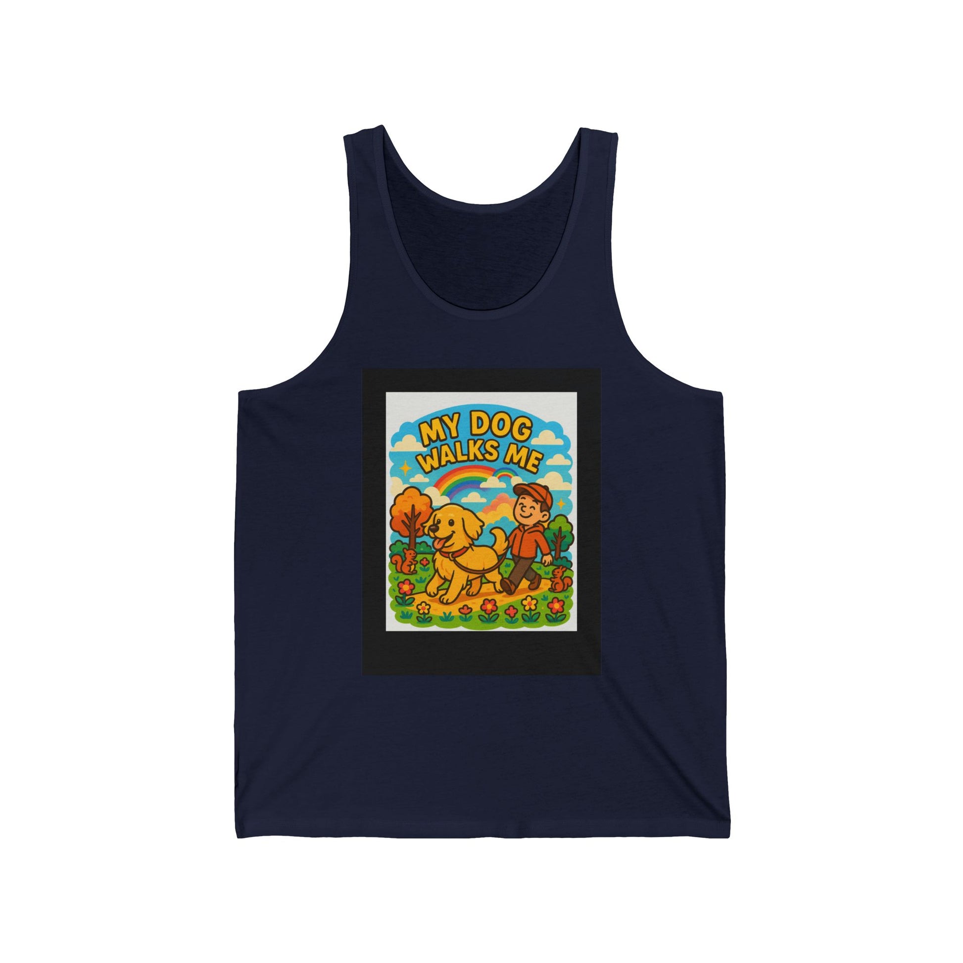 My Dog Walks Me Tank Top, Funny Dog Lover Unisex Jersey Tank, Pet Owner Gift, Summer Casual Wear, Dog Mom Gift Idea